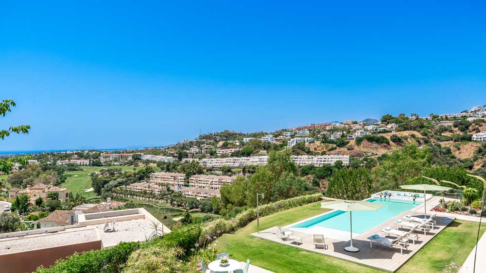 Stunning villa located in a quiet, secure gated community just 10 minutes from Puerto Banús, this stunning modern villa offers luxury, privacy, and breathtaking views. Set on an elevated plot, the property boasts panoramic vistas of the sea, mountains, and nearby golf course. Designed with clean architectural lines and flooded with natural light, the villa features a full domotics system and thermodynamic panels ensure energy efficiency and smart living. The ground floor welcomes you into a spacious open-plan living, dining, and kitchen area, seamlessly connected to the outdoor spaces through floor-to-ceiling glass doors that retract into the walls. A covered terrace offers a climate-controlled entertainment space for all seasons. The heated infinity pool includes a shallow sunbathing section, surrounded by beautifully landscaped gardens. This level also offers two en-suite bedrooms, both with private terraces and privacy glass. Upstairs, the master suite includes a large bathroom, walk-in wardrobe, and an expansive terrace with private shower and stunning sea views. Two additional en-suite bedrooms are also located here; one configured as a junior suite with a private lounge and walk-in closet. The lower level is designed for entertainment and wellness with sauna and hammam, featuring a games room, wine cellar, sauna, and ample storage. A spacious garage accommodates 5–6 vehicles.