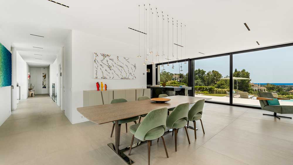 Stunning villa located in a quiet, secure gated community just 10 minutes from Puerto Banús, this stunning modern villa offers luxury, privacy, and breathtaking views. Set on an elevated plot, the property boasts panoramic vistas of the sea, mountains, and nearby golf course. Designed with clean architectural lines and flooded with natural light, the villa features a full domotics system and thermodynamic panels ensure energy efficiency and smart living. The ground floor welcomes you into a spacious open-plan living, dining, and kitchen area, seamlessly connected to the outdoor spaces through floor-to-ceiling glass doors that retract into the walls. A covered terrace offers a climate-controlled entertainment space for all seasons. The heated infinity pool includes a shallow sunbathing section, surrounded by beautifully landscaped gardens. This level also offers two en-suite bedrooms, both with private terraces and privacy glass. Upstairs, the master suite includes a large bathroom, walk-in wardrobe, and an expansive terrace with private shower and stunning sea views. Two additional en-suite bedrooms are also located here; one configured as a junior suite with a private lounge and walk-in closet. The lower level is designed for entertainment and wellness with sauna and hammam, featuring a games room, wine cellar, sauna, and ample storage. A spacious garage accommodates 5–6 vehicles.